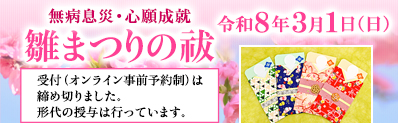 - 「雛まつりの祓」の準備の都合上、当日の祈祷受付は午後1時15分までとさせていただきます。ご祈祷をご希望の方は午前9時から午後1時15分までに「祈祷受付所」へお越しください。